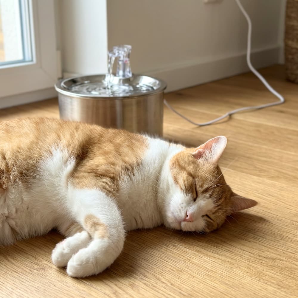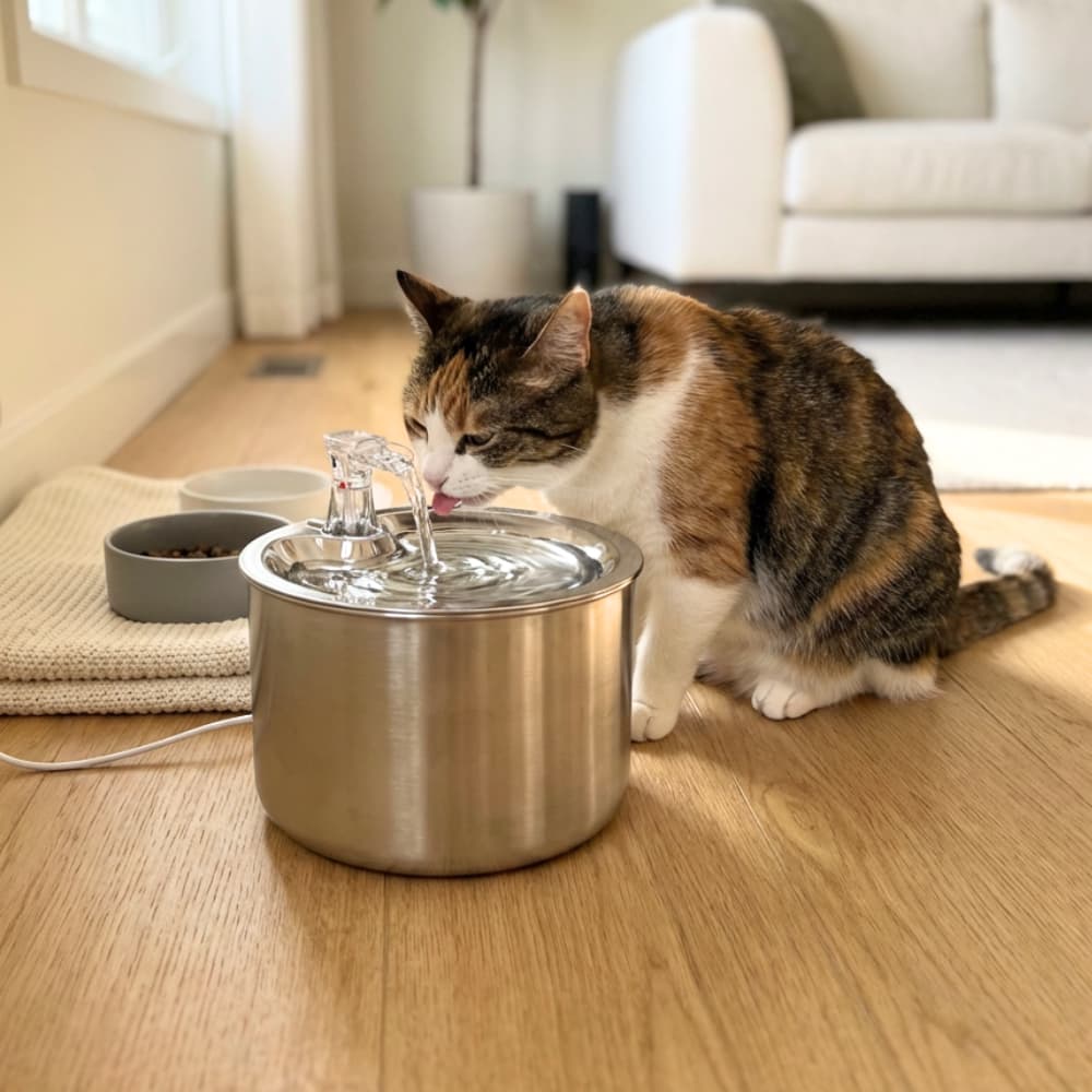The FreshFlow Stainless Steel Fountain automatically encourages your cat to drink more and supports daily hydration.